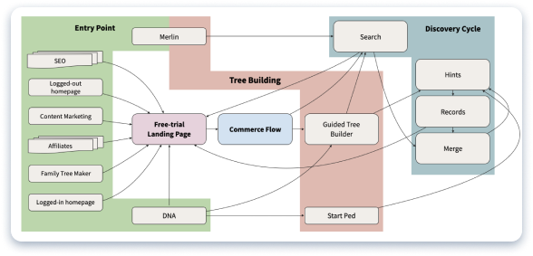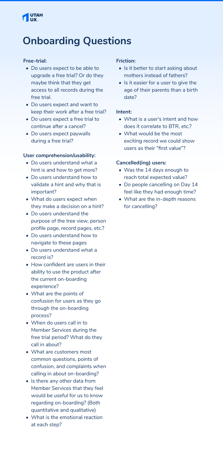 Together, my PM and I began by mapping out existing onboarding flow(s) that led customers into the family history record subscription product. We then gathered any existing data we could find—both qual. and quant. From there, we broke the customer journey flows down into sections that appeared to provide the best opportunity for improvements to the KPIs—while also improving the customer experience. Finally, we generated a list of questions/hypotheses that we wanted to find answers to.
