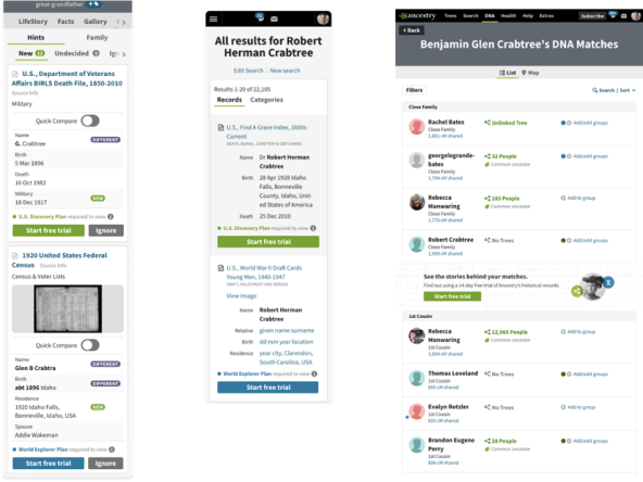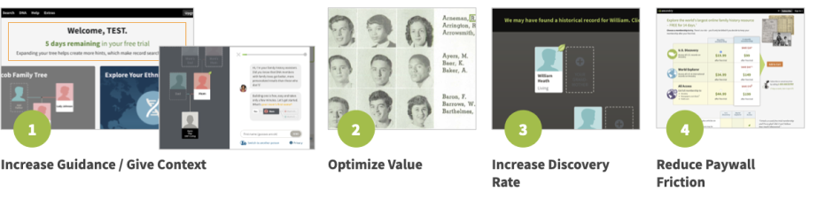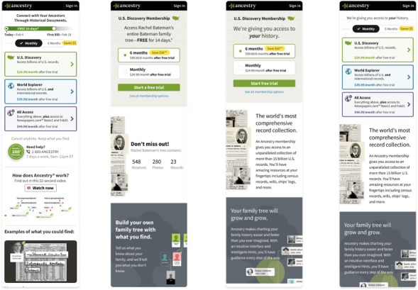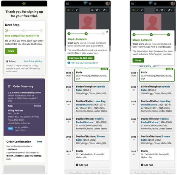Ancestry.com has two product lines: family history record subscriptions, and DNA tests. This particular onboarding initiative was specific to the family history record subscription business. This was a team effort. Special thanks to Liz Brown, Josh Harman, Jasmine Sarkhazi, Jeff Alton, and the Groot Team for their endless collaboration, support, and feedback as we worked on these initiatives together.