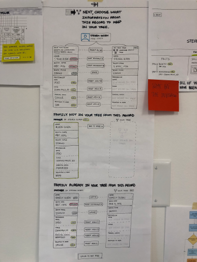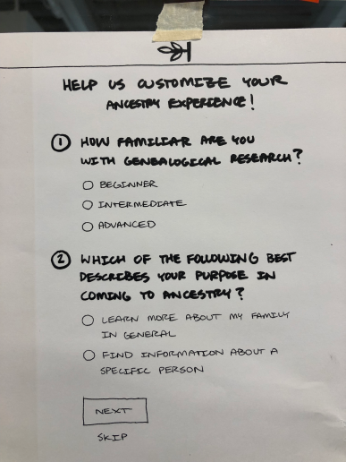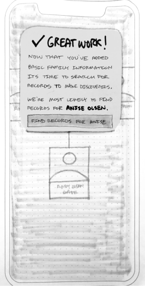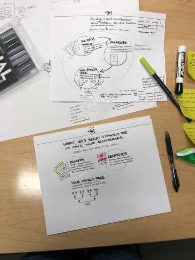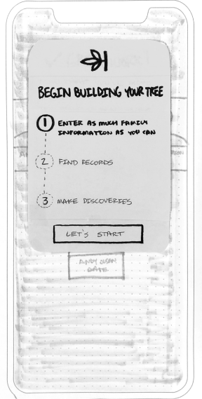 Once we had identified the target audience—free-trialers without family trees—through the quantitative data we gathered, we began to generate concepts to test at each stage in the onboarding process. We began with paper prototypes, and moved on to high-fidelity prototypes—since Ancestry had a design system in place.