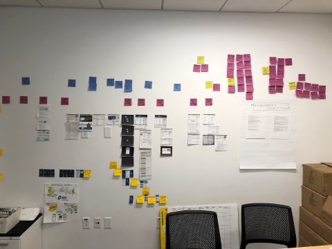 My PM and I spoke with stakeholders in marketing, product, and development to get as complete a picture over the system-level flow of the current onboarding experience. He and I created the following chart to explain the complexity of the onboarding experience at a quick glance. Before creating the graphic, Liz, Josh, and I—mostly Liz—printed out as many pages of the flow we could and annotated them with sticky notes.